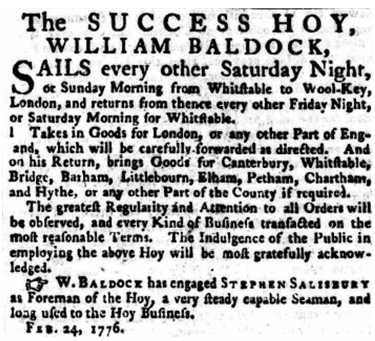 Perhaps this is one reason Why we find Mr William Baldock, gentleman smuggler, purchasing at least two hoys to run between Whitstable and London. These boats operated once a fortnight which begs the question, what were they doing for the rest of the time?