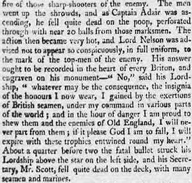 The outpourings of a nation filled column miles of newspapers, magazines, broadsheets and special publications. Below are a few of the quotes that report the rise of the great admiral and the loss the nation experienced on news of his death at Trafalgar on 21 October, 1805.