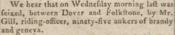 “We hear from Folkstone, that on Friday the 5th inst. was seized near Hythe, by Mr Gill, Riding Officer at Folkstone, thirty casks of foreign Geneva. And on Sunday the 7th of this inst. was seized near Dymchurch, by Mr. Ratcliff, Surveyor at Folkstone, thirty-eight casks of Geneva and Rum; a which goods were deposited in his Majesty’s Warehouse at Folkestone.” (Kentish Gazette – Tuesday 09 January 1770)